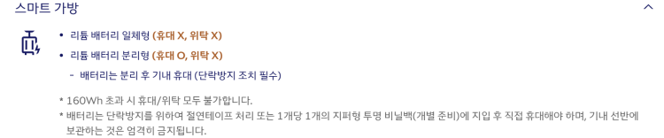 리튬 배터리 분리가 되는 스마트 가방(캐리어) 160wh 미만은 기내 반입이 가능해요. = 위탁수하물로는 불가
