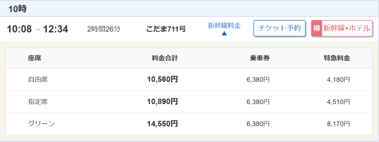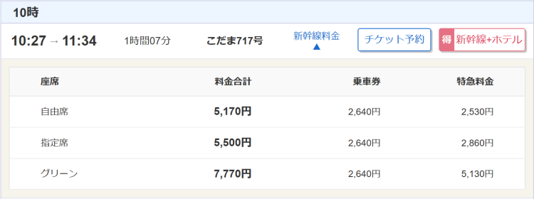 -신칸센 특급권: 자유석 4,180엔, 지정석 4,510엔