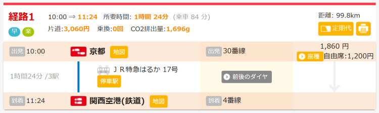4. 교토(京都) → 간사이 공항(関西空港): 자유석 3,060엔, 지정석 3,390엔